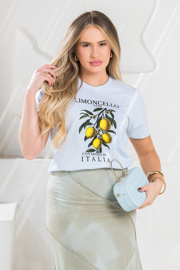 Refrescante e cheia de charme, a Camiseta Feminina Limoncello é perfeita para quem ama um visual leve e delicado. Confeccionada em tecido macio e confortável, ela possui modelagem soltinha, gola redonda e mangas curtas. A estampa com ilustração de limões traz um toque mediterrâneo e romântico, inspirando aquele clima de verão na Itália.