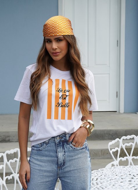 A estampa frontal traz a frase em francês “La Vie Est Belle” (A Vida é Bela), com listras verticais em laranja que adicionam modernidade e frescor à peça. Um design versátil que combina facilmente com jeans, saias e sobreposições, perfeita para composições casuais ou fashionistas.