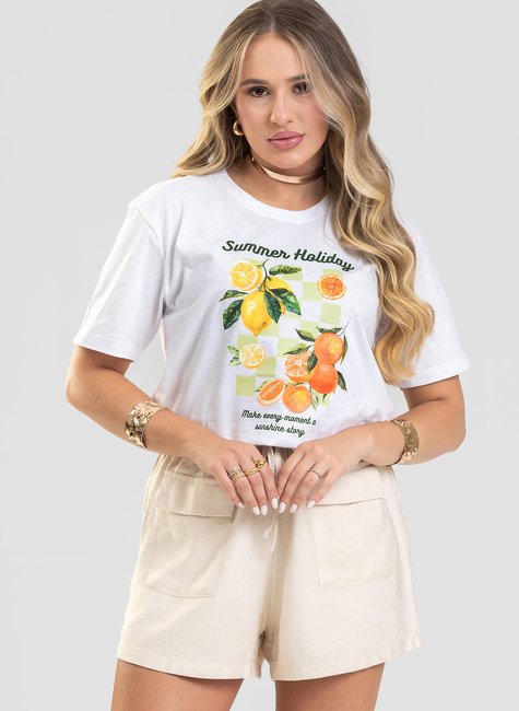 Camiseta feminina confeccionada em malha premium 100% algodão, com toque macio, leve e excelente conforto. Possui estampa frontal “Summer Holiday” com ilustrações de frutas cítricas e fundo xadrez suave, trazendo uma proposta alegre, fresca e com inspiração de verão.