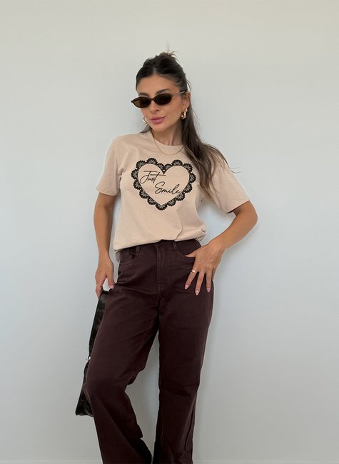 Delicada e charmosa, essa camiseta traz um toque romântico com sua estampa de coração rendado e a frase inspiradora “Just Smile”. Uma peça que une leveza, estilo e positividade para o seu dia a dia.