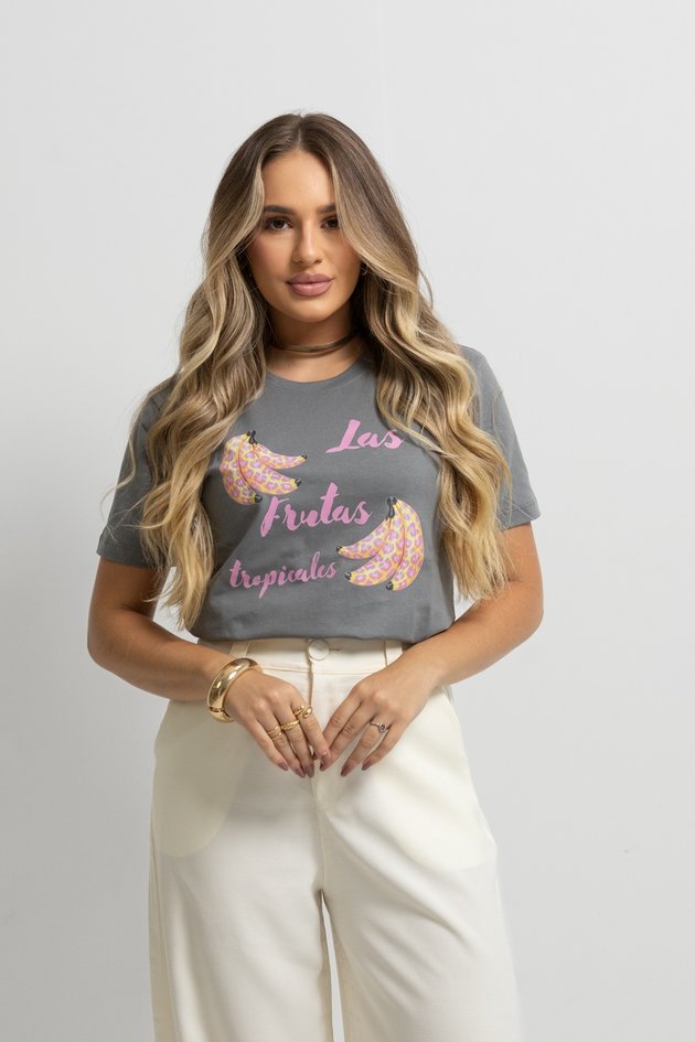 Confeccionada em malha confortável e de toque macio, a peça garante leveza e ótimo caimento para o dia a dia. A cor chumbo cria um contraste elegante com a estampa em tons vibrantes, permitindo combinações versáteis com shorts, saias ou calças para compor looks casuais e estilosos.