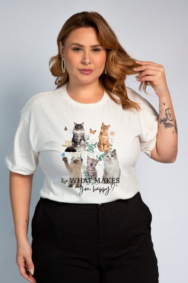Perfeita para as amantes de felinos! Com uma estampa fofa e delicada, essa camiseta traz vários gatinhos adoráveis em meio a borboletas e flores, acompanhados da pergunta “What Makes You Happy?”, despertando leveza e alegria.