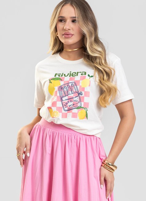 Com uma pegada mediterrânea divertida e super estilosa, esta camiseta feminina traz uma estampa exclusiva inspirada na charmosa Riviera. O design combina uma lata ilustrada de sardinhas com limões vibrantes e fundo xadrez rosa, criando um visual fashion, leve e cheio de personalidade.